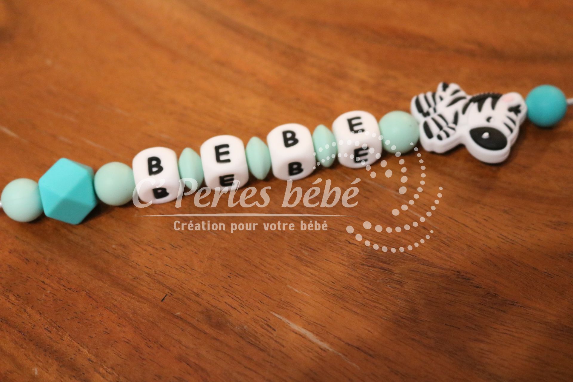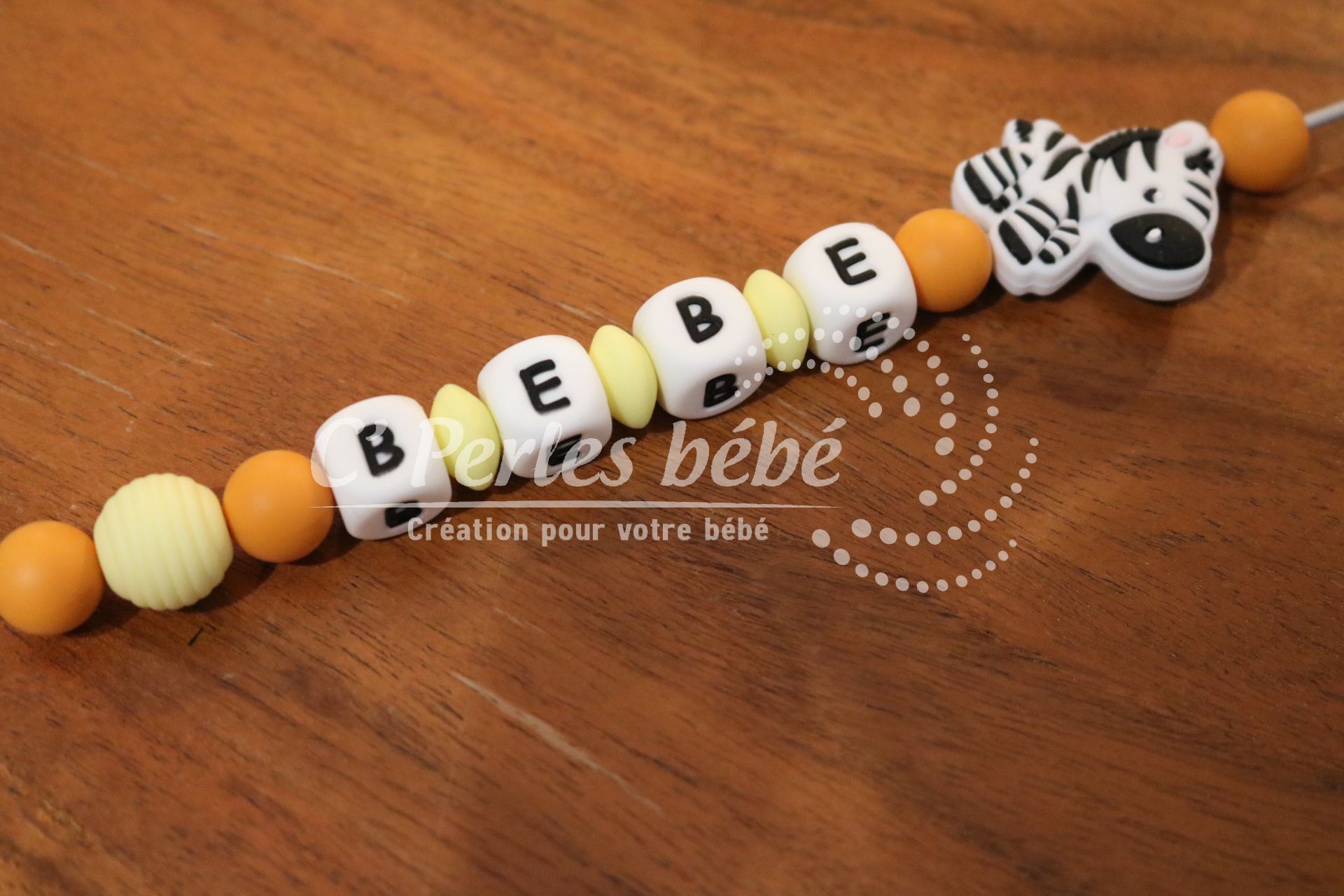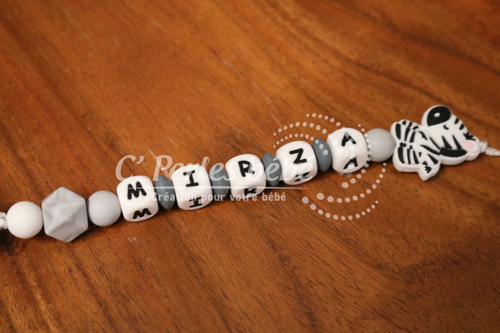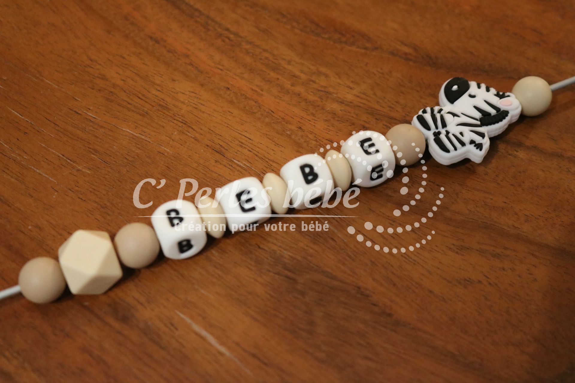 Ce modèle 100% silicone comporte des perles lettres (prénom de votre enfant) séparé de perles plates.