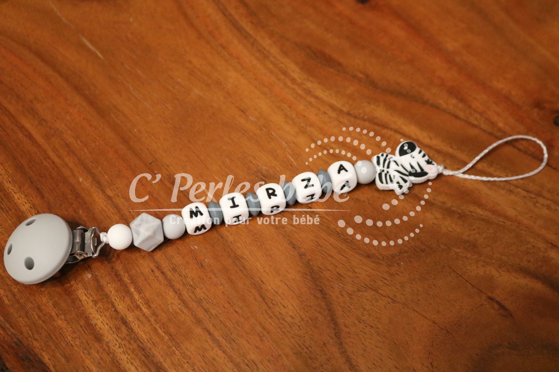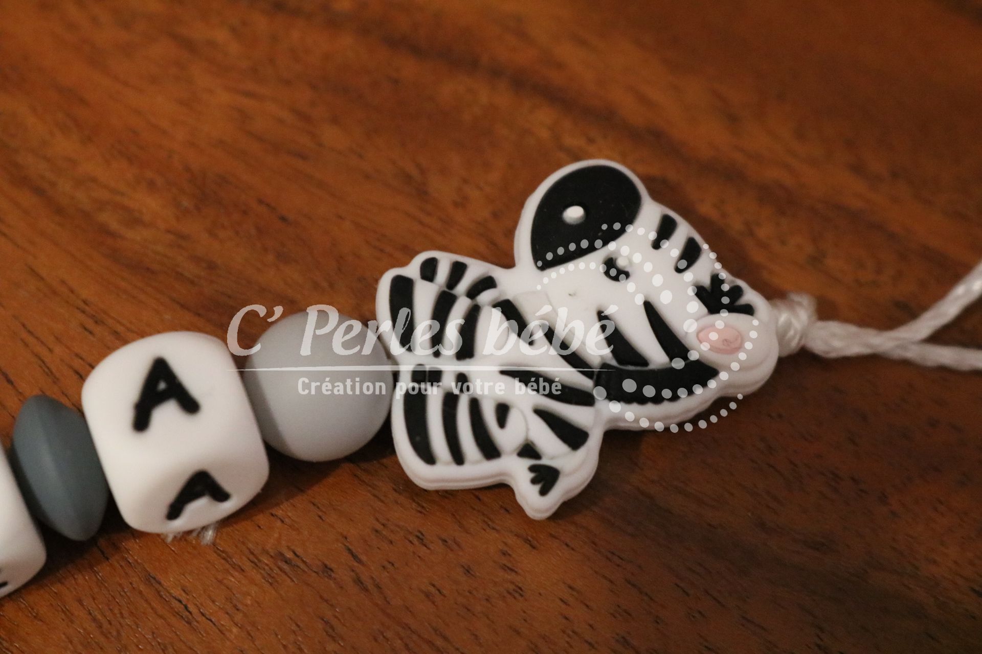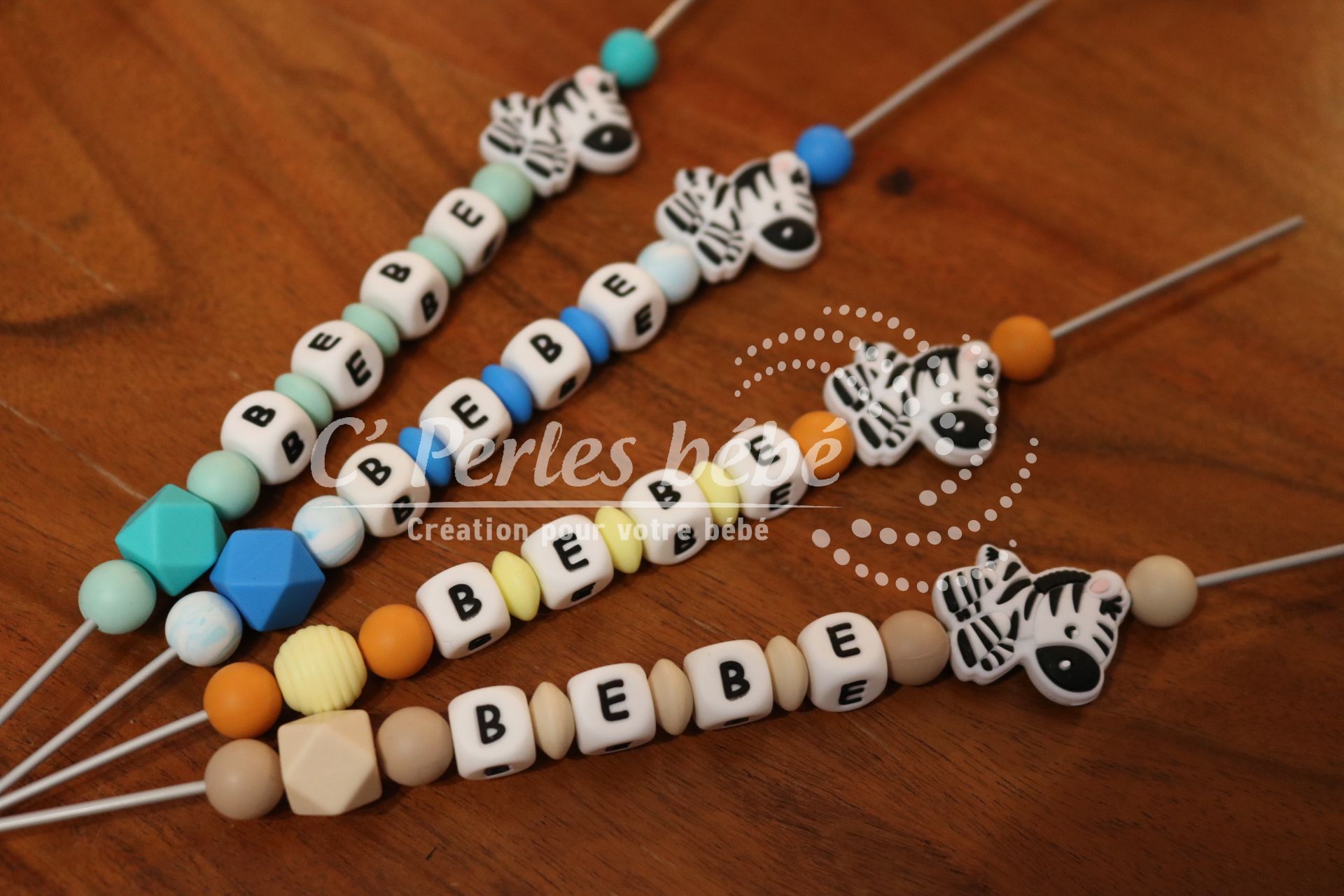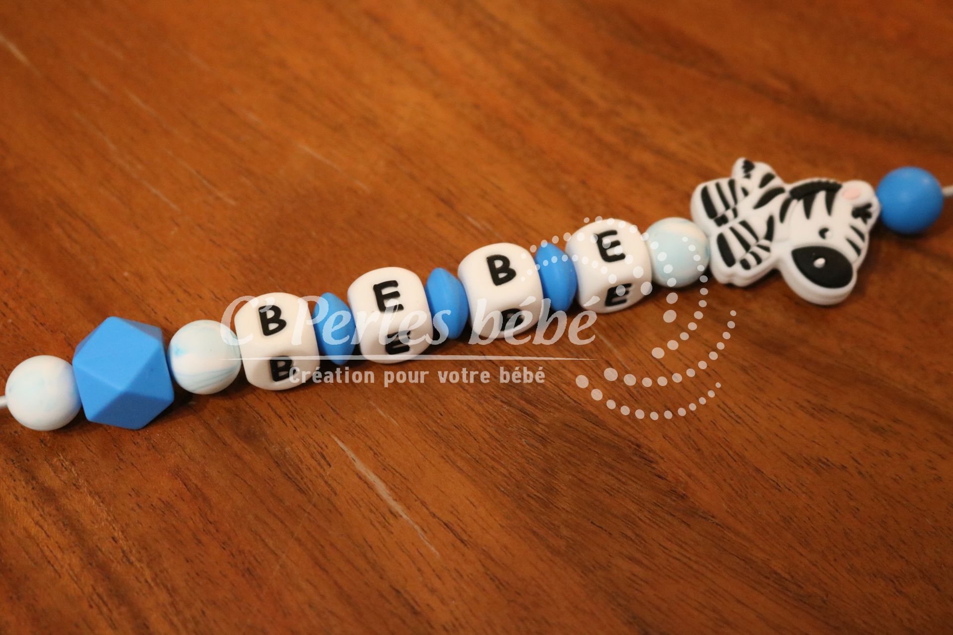 Ce modèle 100% silicone comporte des perles lettres (prénom de votre enfant) séparé de perles plates.