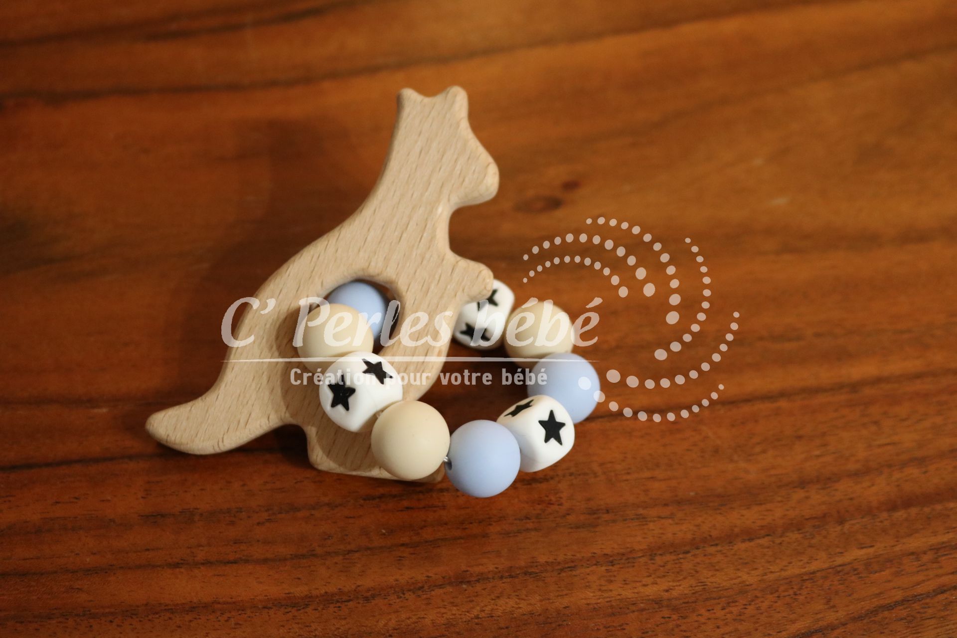 Hochet en bois et silicone personnalisé motif kangourou.