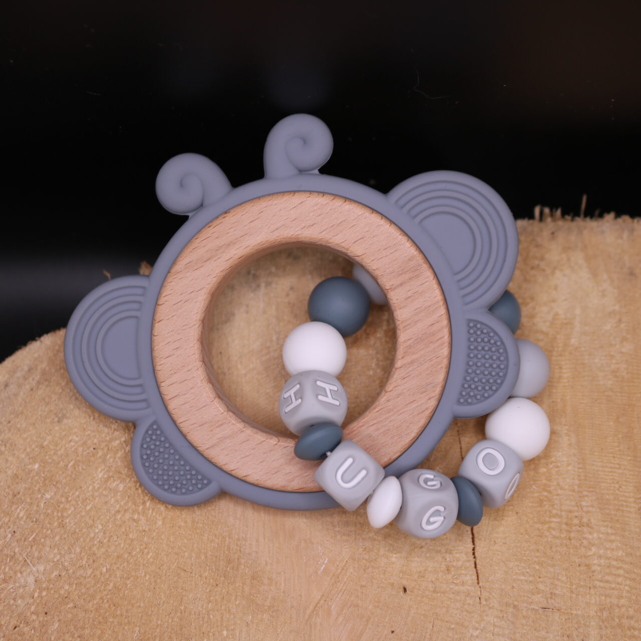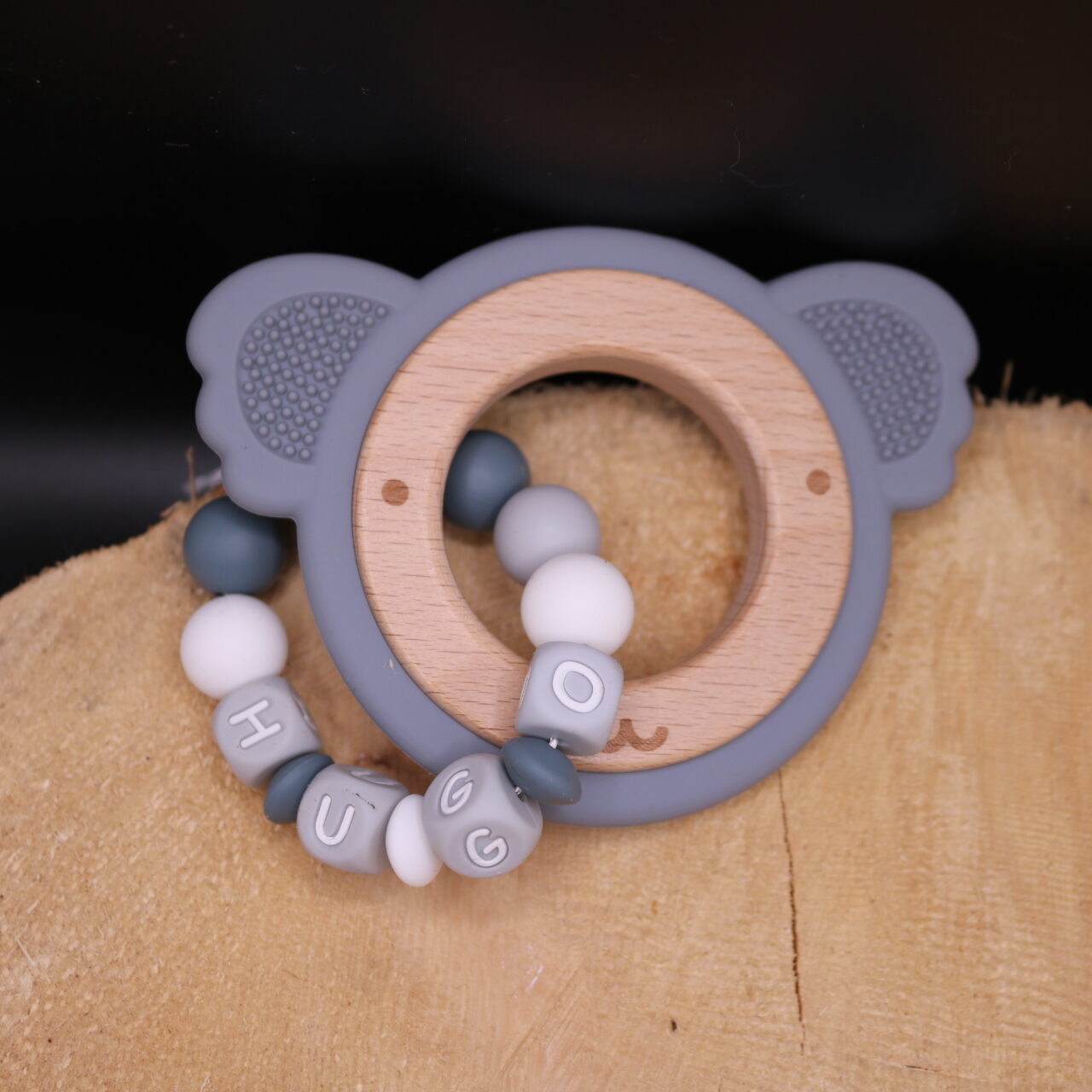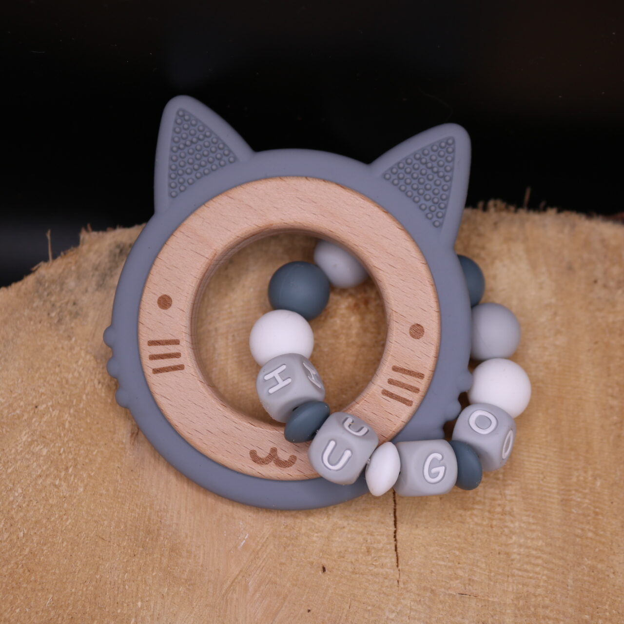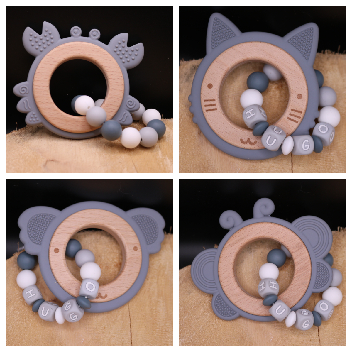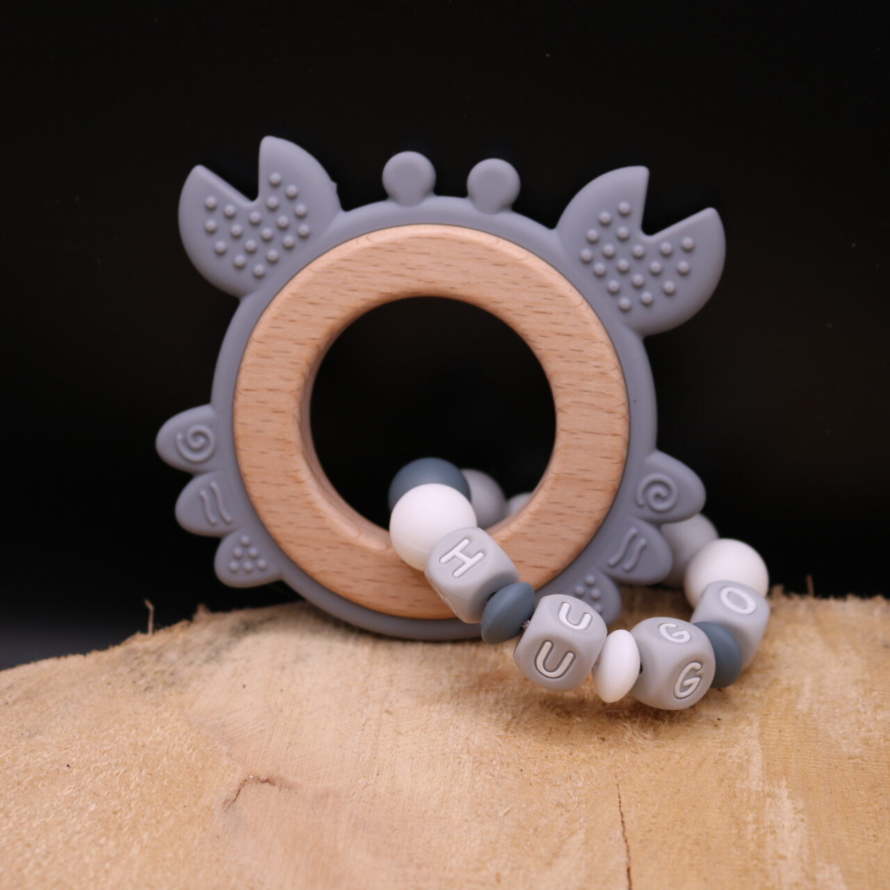 Anneau de dentition en bois et silicone, garanti pour un usage dès la naissance, personnalisé avec des perles en silicone avec ou sans le prénom de l’enfant.